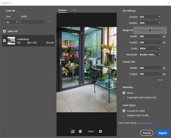 You’ll see a preview of your image, where you can use the + and – icons to adjust your image to 100 percent. Under File Settings on the right, you should check that Format is set to JPG.