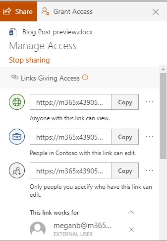This enables a user to share content with their contacts, an email address, or obtain a copy of a shareable link that brings the user accessing it to the content. By default, this allows access to edit the content, but this can be adjusted to read-only.